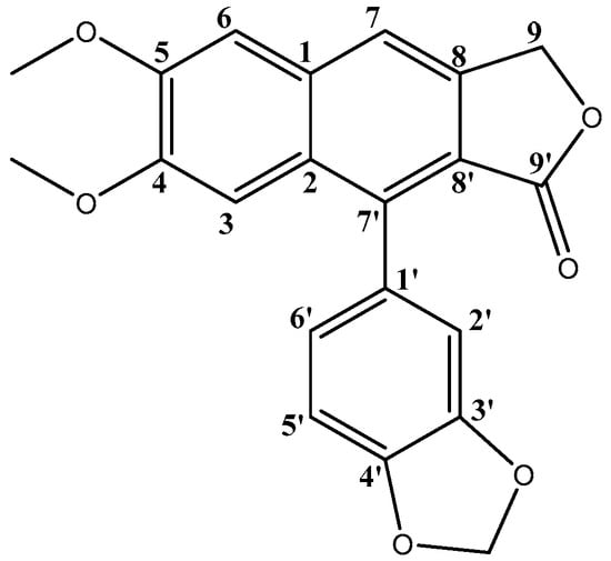 On the other hand, the non-polar extract after the MeOH washings, was concentrated and dissolved in CH2Cl2/MeOH 70:30 (v/v) and extracted twice with water 50:50 (v/v). The aqueous phase was extracted twice with CH2Cl2 50:50 (v/v), and the organic phase was evaporated in a rotavapor to dryness. The extract was fractionated using Sephadex LH-20, allowing isolation of 24 mg (0.01%) of lignan 20, with the following NMR data. 1H-NMR (CDCl3) δ (ppm) 3.82 (s, 3H), 4.05 (s, 3H), 5.38 (d, J = 1.0 Hz, 2H), 6.06 (d, J = 1.5 Hz, 1H), 6.10 (d, J = 1.5 Hz, 1H), 6.83 (dd, J = 7.9, 1.7 Hz, 1H), 6.86 (d, J = 1.7 Hz, 1H), 6.97 (d, J = 7.9 Hz, 1H), 7.11 (s, 1H), 7.19 (s, 1H), 7.70 (s, 1H); and 13C-NMR (CDCl3) δ (ppm) 55.99 (MeO-C5), 56.22 (MeO-C4), 68.19 (C9), 101.40 (O–CH2–O), 106.01 (C6), 106.16 (C3), 108.38 (C5′), 110.73 (C6′), 118.42 (C7), 123.63 (C2′), 128.56 (C1′), 129.02 (C1), 133.33 (C2), 139.68 (C8′), 139.82 (C8), 147.70 (C4′), 147.74 (C3′), 150.23 (C5), 151.98 (C4), 170.12 C9′).