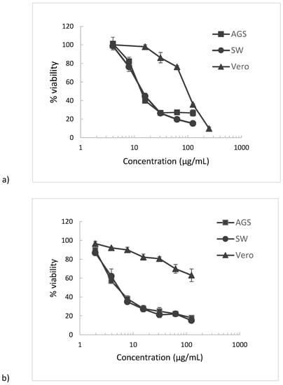 The AGS, SW620, and Vero cells were grown in MEM (10% FBS) in the presence of glutamine (2 mmol/L), penicillin (100 IU/mL), streptomycin (100 µg/L), and amphotericin B (0.25 µg/m), at 37 °C, in a humidified atmosphere (5% CO2). Briefly, 100 µL of 1.5 × 105 cells/mL (suspension) were seeded overnight into 96-well plates to reach 100% confluency. Subsequently, the cells were exposed for 48 h to 50 µL of samples in concentrations varying 1.5–500 µg/mL in MEM (DMSO 0.1% v/v). Controls to establish 100% of viability were prepared, adding 50 µL of MEM (DMSO 0.1% v/v) instead of samples. Afterwards, the medium was eliminated, cells were washed with PBS (100 µL) and incubated with 100 µL of a MTT solution (0.5 mg/mL, final concentration) in PBS, for 2 h at 37 °C. Then, MTT was removed, and the formazan crystals were dissolved in 100 µL of ethanol 95%. Absorbance was read at 570 nm in a microplate reader. DMSO was diluted in media in the same way as the extracts and incubated with the cells for 48 h to be used as control. Dose–response curves were established, and IC50 was calculated. Samples were tested in three independent experiments with different doses of each sample analyzed in triplicate.