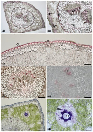 Phloroglucinol staining of healthy, mature Pinus radiata needles indicates that xylem, endodermis, and guard cells are strongly lignified (Figure 1a,b). The hypodermis has a moderately lignified primary cell wall but the inner secondary cell wall is unlignified or weakly lignified. The epidermis and transfusion tissue are weakly lignified. Sudan IV staining of fresh healthy needles indicates the presence of lipid-based cell wall components (cutin and suberin) in the phloem parenchyma, transfusion tissue, and cuticle (Figure 1c–e). NADI reagent indicates the presence of isoprenoids (purple) in the endodermis, transfusion tissue, and in resin canal parenchyma in fresh, healthy needles (Figure 1f,g). Lipids are stained violet-blue in oleoresin within resin ducts, and in cell walls within the cuticle, epidermis, transfusion parenchyma, and phloem parenchyma.