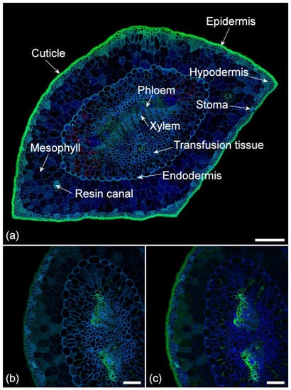 The comparative anatomy of pine needles has been studied in detail [43,44], but there have been few comprehensive histological studies of conifer needles. Investigations have focused on pathological or physiological effects such as fungal infection, acid rain, mineral deficiency, or CO2 enrichment [2,42,45,46,47]. Autofluorescence in combination with histochemistry has been used to explain differences in the mechanical properties of pine needles between species due to variable lignification of the endodermis [34]. Chlorophyll autofluorescence has been used to detect lesion formation in Dothistroma needle blight of radiata pine [47]. We demonstrate the usefulness of autofluorescence in understanding cell wall composition in needle tissues, especially in relation to potential pathological impacts. Autofluorescence, spectral imaging, and fluorescence lifetime imaging [9,10,11,12] will play an increasing role in understanding plant tissue composition.