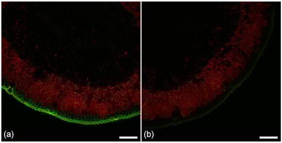 A healthy pine needle showing flavonoid distribution. (a) Treated with Naturstoffreagenz A (NA) for 5 min showing localization of flavonoids (green) in the epidermis and hypodermis; (b) Untreated control at the same gain setting. The red fluorophore is chlorophyll. Sequential excitation at 488 and 561 nm with corresponding emission at 500–570 (green), and 570–700 nm (red). Scale bar = 100 µm.