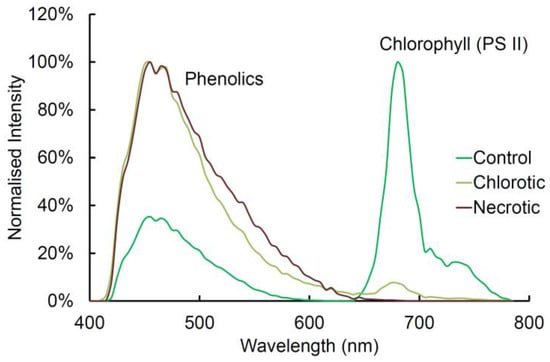 Fluorescence spectra of normal, chlorotic, and necrotic needles from radiata pine. Excitation at 355 nm with emission at 400–800 nm. There are two groups of fluorophores present, blue-green emitters (suberin, lignin, ferulates, flavonoids, and extractives) and orange/red emitters (chlorophyll, photosystem II (PSII)).
