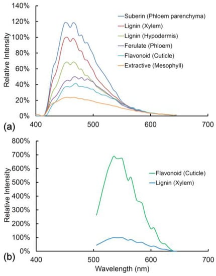 Relatively few studies have characterized plant autofluorescence [1,2,3,6,19,20,31,32,33,34]. Lignin is the only cell wall-associated fluorophore that has been investigated in detail [19], although some limited information is available for hydroxycinnamic acids such as coumarate and ferulate [20,26], as well as suberin [33].