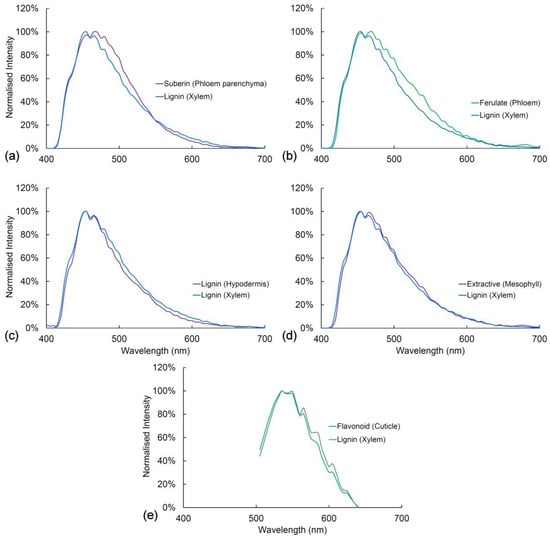 Comparison between lignin and other cell wall fluorophores. (a) Lignin and suberin have similar spectra with UV excitation (355 nm), ; (b) Lignin and ferulate have significantly different spectra with UV excitation, ; (c) Lignin from xylem and hypodermis have identical spectra with UV excitation, ; (d) Lignin from xylem and extractives in the mesophyll have identical spectra with UV excitation, ; (e) Lignin and flavonoids have identical spectra with blue excitation (488 nm), . ns = non-significant, * = p < 0.05, ** p < 0.01, *** p < 0.001.