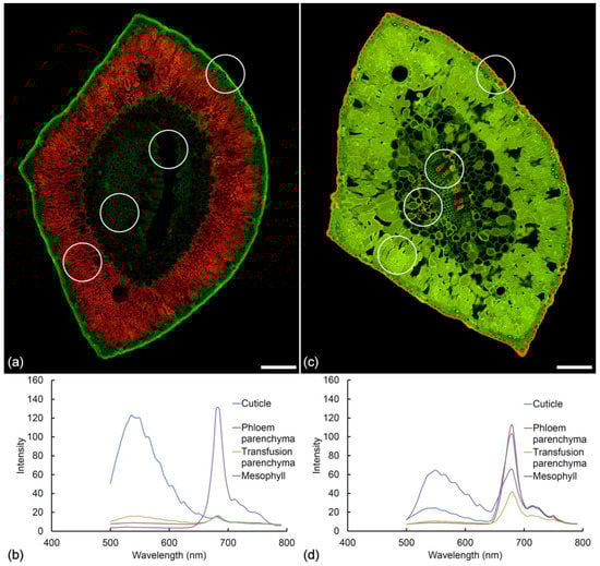 Autofluorescence of a healthy needle before and after fixation in Formalin Aceto Alcohol (FAA). Sequential excitation at 488 and 561 nm with corresponding emission at 500–570 and 570–700 nm. (a) Fresh pine needle and (b) emission spectra from the cuticle, phloem parenchyma, transfusion parenchyma, and mesophyll, the later showing intense chlorophyll fluorescence. Scale bar = 200 µm. (c) Pine needle fixed in FAA for 1 month. The cuticle, phloem parenchyma, and transfusion parenchyma exhibit a new fluorophore showing orange emission while extractives in the mesophyll now show strong green fluorescence. Scale bar = 200 µm. (d) Spectra acquired from the cuticle, phloem parenchyma, and transfusion parenchyma with 488 nm excitation indicate the orange fluorophore is chlorophyll with its characteristic twin peaks, redistributed by the ethanol-based fixative.