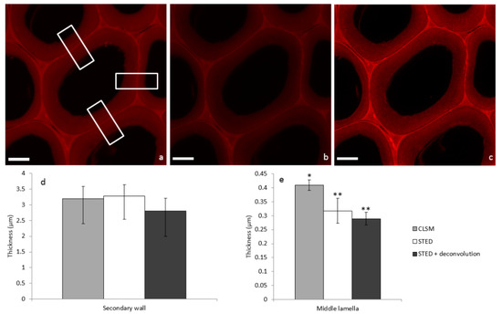 - Donaldson, L.A.; Kroese, H.W.; Hill, S.J.; Franich, R.A. Detection of wood cell wall porosity using small carbohydrate molecules and confocal fluorescence microscopy. J. Microsc. 2015, 259, 228–236. [Google Scholar] [CrossRef] [PubMed]