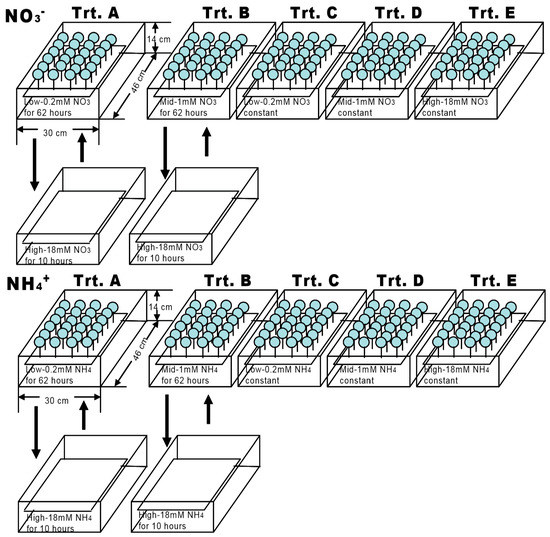 The nutrient treatments were applied (Figure 1) as the plants were transplanted. Three concentrations, low (0.2 mM), medium (1 mM), and high (18 mM) of NO3− and NH4+ were used consistently throughout the experiment (stable treatment), or the plants were shifted between low and high or between medium and high on a 72 h cycle (62 h at the lower concentration followed by 10 h at the high concentration) (variable treatment).
