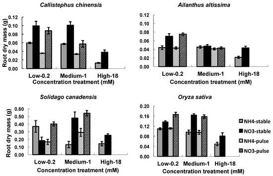Our experiment produced substantial intra- and inter-specific variations in root biomass. In general, NO3− resulted in more root growth than NH4+, but the high concentration of both NO3− and NH4+ reduced root growth when compared to the medium and low concentrations. These results were consistent, at least in part, with other reports. Root growth is often inhibited by high concentrations of NH4+ [55]. In this study, we observed higher root biomass in the NO3− treatments than in the NH4+ treatments probably due to ammonium toxicity. Studies have reported that plants with NH4+ as a sole N source can lead to toxicity, especially at high concentrations [56,57]. The negative effect of abundant NH4+ on plant growth may be caused by induction of nutrient deficiency of other ions or alterations in internal pH [55,56].