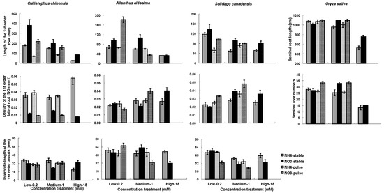 Two architectural traits of the root systems (1st order root length and density of 1st order laterals) were very responsive to the nitrogen treatments (Figure 3). They tend to be negatively correlated; i.e., fine roots that are sparsely attached along a root axis tend to be longer, while those that are densely packed along a root axis are shorter. In our study, Pearson correlations between the two traits in C. chinensis, S. canadensis, and A. altissima were −0.61, −0.166, and −0.64, with p-values of <0.0001, 0.357, and <0.0001, respectively. It is difficult to generalize these results across plant species because most studies examining the impact of external N on the root branching have focused on molecular mechanisms in Arabidopsis and a few other model species [16,42]. However, in these studies of model plant species, the negative effects of high NO3− or NH4+ concentrations on lateral root development or elongation have been frequently reported [18,42,57,60]. The seminal and crown roots of maize were inhibited at high NO3− concentration of 5 mM [18]. Arabidopsis seedlings were grown at 1 mM and 50 mM KNO3, and the results showed that the LR development was strongly depressed at the higher NO3− concentration [60]. In this study, we found complicated root architecture responses to high concentrations of NO3− and NH4+. The highest (18 mM) concentrations of NO3− or NH4+ led to the least seminal root length in O. sativa and the least length of 1st order roots on the other three species (Figure 3). However, the density of 1st order roots was greatest at 18 mM NO3− in C. chinensis and greatest at 18 mM NH4+ in A. altissima (Figure 3). The different responses may reflect variation among species in the way their roots have adapted to N heterogeneity.