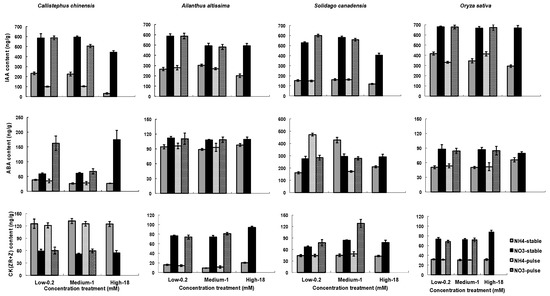 Hormone contents were significantly influenced by treatments (Table 3). N type had a much stronger and more consistent effect across species than did nutrient concentration or temporal application of nutrients (Figure 4). All of the species demonstrated much higher IAA contents in the NO3− than in the NH4+ treatments, and in general, root IAA content was lower at 18 mM NO3− or NH4+ than at the other two tested nitrogen concentrations, with the exception of at 18 mM NO3− or NH4+ in Oryza sativa (Figure 4). Root IAA content of C. chinensis decreased significantly in variable treatments than in stable treatments, but not of the other three species. Root ABA content tended to be greater in the NO3− than in the NH4+treatment as well, except in S. canadensis where a considerable variability was observed (Figure 4). Root content of CK(ZR+R) was strongly affected by N types, with higher values as NO3− was applied except in C. chinensis where the order was reversed (Figure 4).