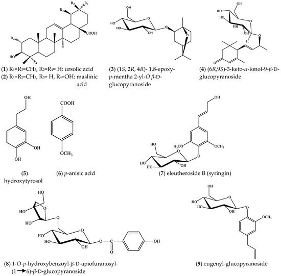 In the present study, overall, 20 compounds were isolated from S. willeana polar extracts, i.e., two triterpenoids, namely ursolic acid (1) and maslinic acid (2), one monoterpene glucoside, (1S,2R,4R)-1,8-epoxy-p-menthan-2-yl-O-β-d-glucopyranoside (3), one megastigmane glucoside, (6R,9S)-3-oxo-α-ionol β-d-glucopyranoside (4), five simple phenolic compounds, i.e., hydroxy-tyrosol (5), p-anisic acid (6), eleutheroside B (syringin) (7), 1-O-p-hydroxybenzoyl-β-d-apiofuranosyl-(1→6)-β-d-glucopyranoside (8) and eugenylglucoside (9), two acetophenones, 4-O-β-d-glucopyranosyl acetophenone (picein) (10) and 4-hydroxy-acetophenone 4-O-(3,5-dimethoxy-4-hydroxybenzoyl)-β-d-glucopyranoside (11), two caffeic acid oligomers, rosmarinic acid (12) and salvianolic acid K (13), three flavonoids, luteolin-7-O-β-d-glucoside (cynaroside) (14), 6-hydroxyluteolin 7-O-β-d-glucoside (15) and hesperidin (16), two lignans, syringaresinol-4-O-β-d-glucopyranoside (17), pinoresinol-4-O-β-d-glucopyranoside (18) and two fatty acids: linoleic acid (19) and methyl α-linolenate (20).