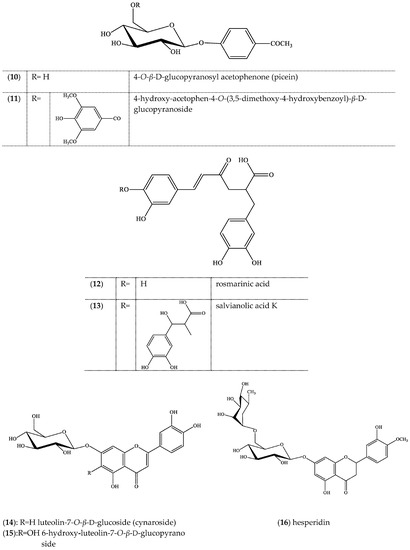 - Lu, Y.; Foo, L.Y. Flavonoid and phenolic glycosides from Salvia officinalis. Phytochemistry 2000, 55, 263–267. [Google Scholar] [CrossRef]