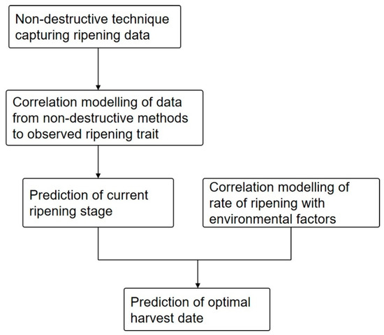 Currently, the harvest time is mainly estimated by counting of days after flowering, subjective tasting, or visual assessment of fruit colour, texture or plant canopy structure [17,18]. All of these methods on their own or in combination are time consuming and not necessarily accurate. The quality attributes or the maturity indices derived from non-destructive techniques can, however, be modelled to predict the optimal time of harvest. Such predictions need to account for changes in environmental conditions and, being a primary factor affecting the rate of plant development [19], air temperature is a key parameter utilized in models predicting optimal harvest time [20]. An example of a typical approach in developing a work flow for predicting an optimal harvest date is given in Figure 1.