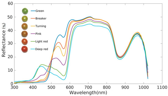 Typical progressive change of reflectance spectra at different ripening stages of tomato.