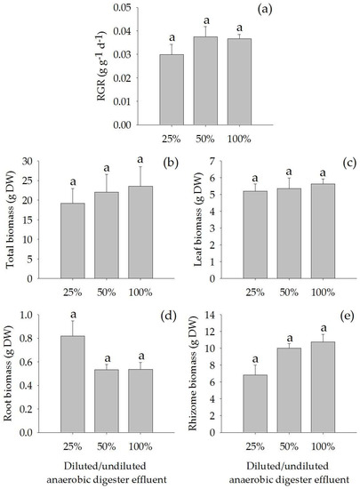 Relative growth rate (RGR) (a), total biomass (b), leaf biomass (c), root biomass (d) and rhizome biomass (e) (Mean ± SE) of Acorus calamus grown on diluted anaerobic digester effluent (25% and 50%) and undiluted anaerobic digester effluent (100%) for a period of 56 days.