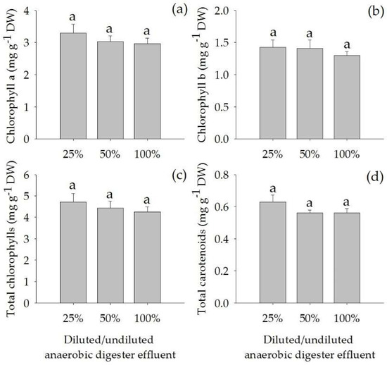 Concentrations of chlorophyll a (a), chlorophyll b (b), total chlorophylls (c) and total carotenoids (d) (Mean ± SE) in leaves of Acorus calamus grown on diluted anaerobic digester effluent (25% and 50%) and undiluted anaerobic digester effluent (100%) for a period of 56 days.