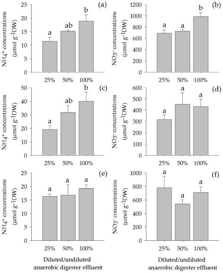 The concentrations of anaerobic digester effluent significantly affected the concentrations of NH4+ and NO3− in the leaves and that of NH4+ in the roots (p < 0.05). The NH4+ concentrations in leaves and roots increased with increasing concentrations of the anaerobic digester effluent (Figure 4a,b). The concentrations of NO3− in leaves were highest in plants grown on 100% anaerobic digester effluent (Figure 4b). Nonetheless, the concentrations of NH4+ in the rhizomes, and NO3− in the roots and the rhizomes did not significantly differ among treatments (Figure 4d–f).