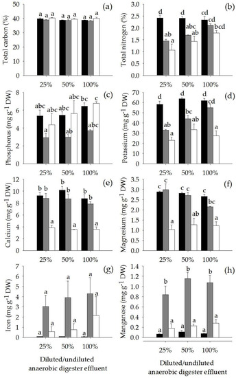 Concentrations of total carbon (a), total nitrogen (b), phosphorus (c), potassium (d), calcium (e), magnesium (f), iron (g) and manganese (h) (Mean ± SE) in leaves (■), roots (■) and rhizomes (☐) (Mean ± SE) of Acorus calamus grown on diluted anaerobic digester effluent (25% and 50%) and undiluted anaerobic digester effluent (100%) for 56 days. Different letters indicate significant differences among treatments.