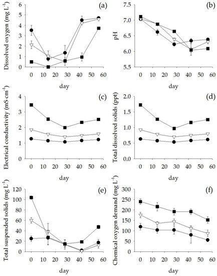 The water samples (800 mL) from each treatment were collected at the beginning of the experiment and every 14 days after experimental set-up for a total period of 56 days. Electrical Conductivity (EC), Total Dissolved Solids (TDS), and pH were measured using a multi-parameter analyzer (CyberScan PC 300, Eutech Instruments Pte Ltd., Singapore). Dissolved Oxygen (DO) was analyzed by an azide modification method (4500-O C) [36]. Chemical Oxygen Demand (COD) was analyzed by a close reflux, titrimetric method (5220 C) [36]. Total Suspended Solids (TSS) was analyzed using a standard method 2540 D [36]. Then, the filtered water samples were analyzed for concentrations of ammonium nitrogen (NH4-N), nitrate nitrogen (NO3-N) and orthophosphate (PO4-P). Ammonium nitrogen concentration was analyzed using a modified salicylate method (Quikchem Method no. 10-107-06-3-B; Lachat Instruments, Milwaukee, WI, USA). Nitrate nitrogen concentration was analyzed by an UV-method [35]. Orthophosphate was analyzed by a stannous chloride method (4500-P D) [36].