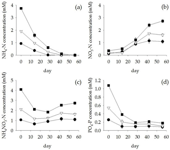 After 56 days of treating the anaerobic digester effluent, the water quality generally improved. Dissolved oxygen dramatically decreased during the first two weeks (Figure 6a). The average pH of the anaerobic digester effluent was 6.3 ± 0.2 across the treatments (Figure 6b). Electrical Conductivity (EC) and Total Dissolved Solids (TDS) were slightly reduced (14% and 27% removal) in 50% diluted anaerobic digester effluent and 100% anaerobic digester effluent, respectively (Figure 6c,d). In addition, the TSS in the anaerobic digester effluent was reduced by 40–85% after 28 days and 82–98% after 42 days of treatments (Figure 6e). The COD gradually decreased, reaching a total removal of 37–57% (Figure 6f). For the nutrients, high NH4-N removal (>80% removal) was found in all treatments (Figure 7a) whereas the concentrations of NO3-N increased to 1.1, 1.6 and 2.7 mM in the 25%, 50%, and 100% anaerobic digester effluent, respectively (Figure 7b). However, the concentration of NH4NO3-N was reduced by 15–55% within 28 days (Figure 7c). Similarly, PO4-P was removed by 64–84% at day 28 for all treatments (Figure 7d).