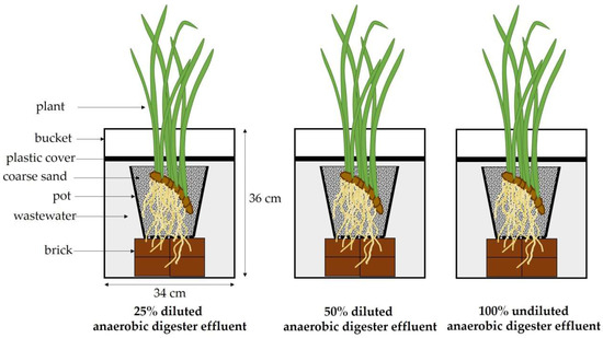 Schematic presentation of the experimental set-up of Acorus calamus grown on 25% and 50% diluted anaerobic digester effluent and 100% undiluted anaerobic digester effluent.