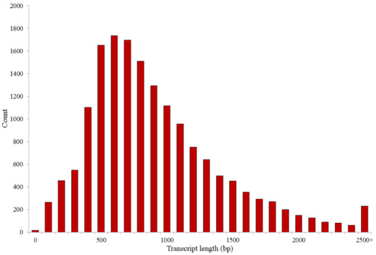 Previously unreported RNA-seq metrics with significance to this study are as follows: a total of 425.75 Mbp of sequence from 2,584,552 reads were generated. After quality filtering and adapter trimming, a total of 343.61 Mbp from 2,413,892 reads remained (Table 1). These reads were combined for de novo transcriptome assembly, yielding 16,544 unique transcript contigs with an average length of 963 bp, as previously described in [14]. Furthermore, previously unreported assembly metrics include a maximum transcript length of 8343 bp and a minimum length of 37 bp. The total length of all transcripts combined was approximately 15.9 Mbp and an N50 length of 1110 bp. The distribution of assembled transcript lengths is shown in Figure 1.