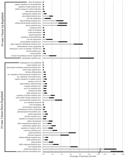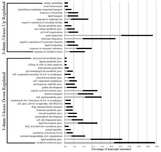 Figure 3. S-locus up- and down-regulated transcript over-represented biological process gene ontology terms. Grey bars represent percentage of all transcripts in the transcriptomes annotated with the respective term. Black bars represent the percentage of DE transcripts annotated with the respective term. The tips of the black bars represent the actual percentage observed.