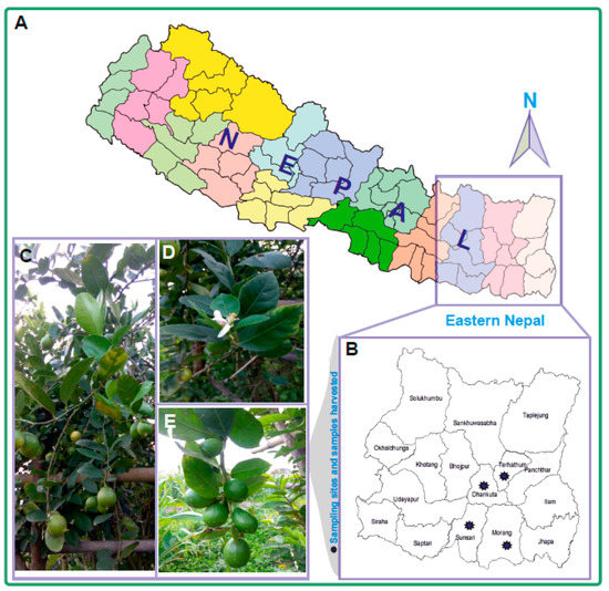 Figure 1. The sampling sites and acid lime pictures used for the experiment. (A) Map of Nepal; (B) sites from where the samples were harvested; (CE) trees and branches from which the samples were harvested.