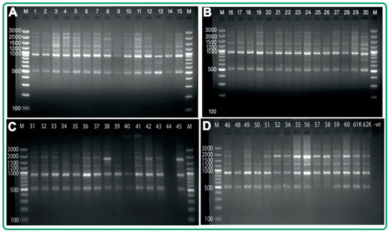 Figure 2. Inter-simple sequence repeat (ISSR) profile generated by the primer (C8). Lanes marked with M is 100 bp plus molecular weight markers. (A) Lanes 1–15 represent acid lime samples 1–15; (B) lanes 16–30 represent Acid lime samples 16–30; (C) lanes 31–45 represent acid lime samples 31–45; (D) lanes 46–62K represent acid lime samples 46–62K.