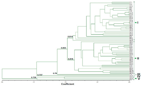 Figure 3. Phenogram generated for 60 Citrus aurantifolia (Acid lime) cultivars (please refer to Table 1 for sample details) by unweighted pair group method of arithmetic averages (UPGMA) cluster analysis, using the Dice similarity coefficient computed from 234 ISSR loci generated by 21 primers. The clusters are labeled as I, II, III, IV, and V.