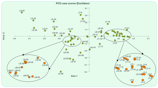 Figure 4. Principal coordinate analysis (PCoA) of Dice’s similarity matrix, carried out with Multivariate Statistical Package (MVSP) 3.21.