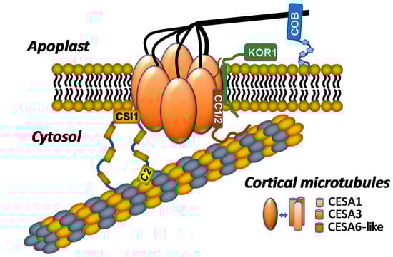- Li, S.D.; Lei, L.; Somerville, C.R.; Gu, Y. Cellulose synthase interactive protein 1 (CSI1) links microtubules and cellulose synthase complexes. Proc. Natl. Acad. Sci. USA 2012, 109, 185–190. [Google Scholar] [CrossRef] [PubMed]