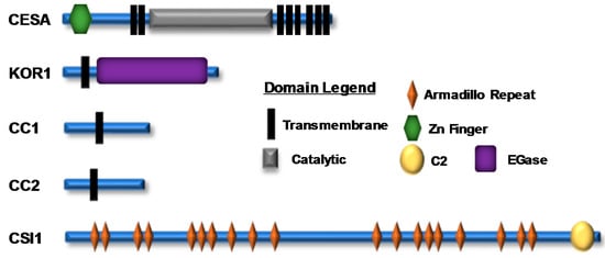 In addition to CESAs, numerous CSC-associated subunits have been identified, primarily through transcriptional co-expression analyses, through genetic analyses of mutants compromised in cellulose biosynthesis, or through yeast two-hybrid screens [,,,]. Among these CSC-associated proteins are KORRIGAN1 (KOR1), cellulose synthase interactive protein 1 (CSI1), the companion of cellulose synthase (CC) proteins, and the glycosylphosphatidylinositol (GPI)-anchored protein COBRA (Figure 1).