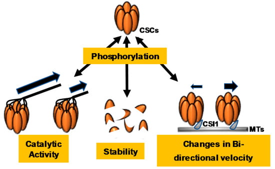 Plant cell-wall biosynthesis changes in response to many environmental and cellular cues, which can negatively or positively impact the deposition of newly synthesized cell-wall material, suggesting that this biosynthetic process is intricately controlled at multiple regulatory levels. Considering these observations, it is important to note that numerous large-scale phosphoproteomic surveys have identified a myriad of post-translational phosphorylation sites within CSC subunits [,,]. For example, CESA proteins are phosphorylated at numerous positions throughout their N-terminal domains or in the hypervariable region of their large central catalytic loop (Figure 2). Additionally, CSC accessory proteins, such as CSI1, KOR1, and the CC proteins, are extensively phosphorylated throughout their cytosolic domains. These observations suggest that post-translational phosphorylation plays an important role in governing plant cellulose biosynthesis (Figure 2) [,,,,].