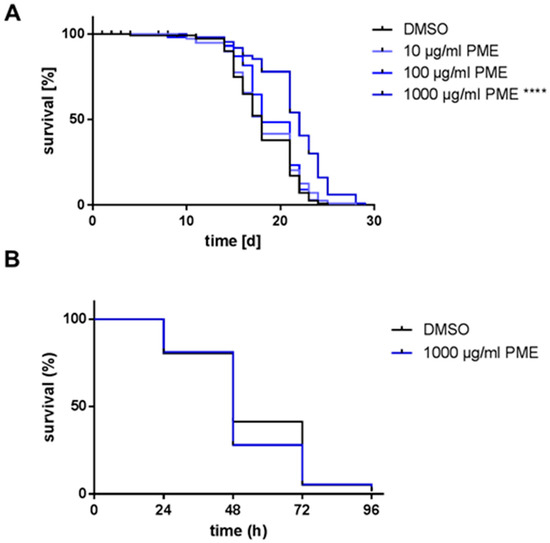 Since PME is traditionally used as anti-aging medicine, we investigated if the extract is able to prolong the life span of the model organism Caenorhabditis elegans. Incubation with the highest concentration of the extract (1000 µg/mL) increased the mean life span by 18.6% (21.5 days in PME-treated animals vs. 18.1 days in control animals). The other concentrations used (10, 100 µg/mL) were not able to cause a significant prolongation of the life span (increase of 1.5% and 4.8%, respectively, Figure 1A, Table 1).