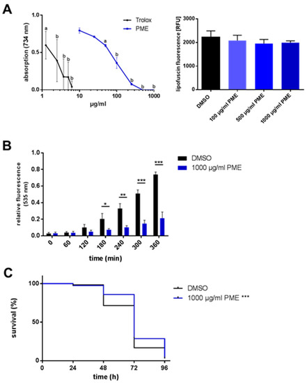 Antioxidative and radical-scavenging effects of PME. (A) Radical scavenging assay: In the cell-free TEAC assay, PME exerts antioxidative properties. Values are mean ± SD, n = 3, one-way ANOVA with Dunnett’s multiple comparisons test vs. control (0 µg/mL), a: p ≤ 0.05, b: p ≤ 0.0001 (left side). Lipofuscin accumulation: Wild type L4 larvae (N2) were treated at 20 °C with PME or DMSO (vehicle, 0.4%) for 72 h, followed by 24 h in media without PME, then lipofuscin fluorescence was measured. Values are mean ± SD, n = 3 (20 individuals per group), one-way ANOVA with Dunnett’s multiple comparisons test, right side). (B) Wild type L4 larvae (N2) were treated with PME or DMSO (vehicle, 0.4%) for 48 h at 20 °C, then transferred into wells of a microtiter plate containing H2DCF-DA. The thermally-induced increase in ROS was detected via DCF fluorescence (emission: 535 nm). Values are mean ± SD, normalized to DMSO at 420 min, n = 3 (16 individuals per group), unpaired t-test, * p ≤ 0.05, ** p ≤ 0.01, *** p ≤ 0.001 vs. DMSO. (C) Wild type L4 larvae (N2) were treated with PME or DMSO (vehicle, 0.4%) for 72 h, then nematodes were transferred into PME-free medium containing 50 mm paraquat. Survival of the nematodes was analyzed by touch-provoked movement every 24 h. Kaplan-Meier statistics were used for the comparison of the survival curves, n = 3 (60 individuals per group), Gehan–Breslow–Wilcoxon test, *** p = 0.0004.
