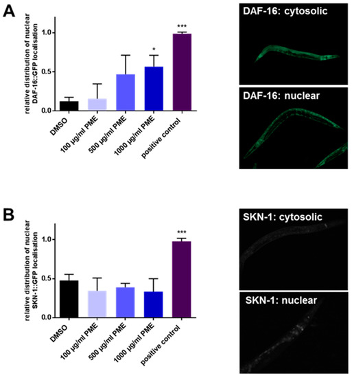 We analyzed if the insulin-like signaling (IlS) pathway is involved in the protective effects caused by PME. The IlS pathway is a pivotal aging and stress response associated pathway that regulates the activities of the transcription factors DAF-16 and SKN-1. Using transgenic DAF-16: GFP and SKN-1: GFP nematodes the localization of the transcription factors was investigated. The nuclear localization of the transcription factor DAF-16 is strongly enhanced by PME: 1000 µg/mL PME increases the amount of nematodes with a mainly nuclear phenotype 4.65-fold (control: 12.2% vs. 56.7% PME 1000 µg/mL). 500 µg/mL caused a similar, but non-significant effect, while 100 µg/mL caused no increase in the amount of animals with nuclear localized DAF-16 (Figure 3A). Next, we analyzed the localization of SKN-1, a homologue of the mammalian Nrf2. However, no increase in the nuclear localization of SKN-1 was detectable, even at the highest concentration used (Figure 3B).