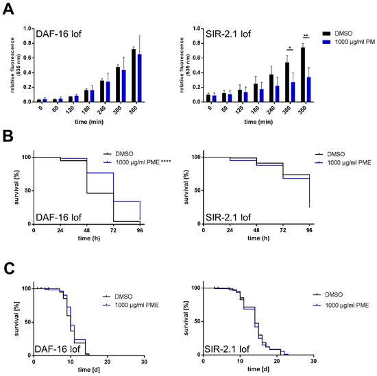 Sirtuins, proteins that show e.g., histone deacetylase activity, play a pivotal role in the molecular mechanism of life prolongation. Therefore, we used a SIR-2.1-deficient nematode strain (VC199) to analyze if this protein is necessary to exert the effects of PME. Since the radical scavenging effect of PME in this strain is comparable to that in wild-type animals (Figure 4A), SIR-2.1 seems not to be responsible for that protective effect of PME. On the other hand, using this SIR-2.1-deficient strain, PME was not able to protect against paraquat stress (Figure 4B, right side: mean survival of DMSO-treated nematodes: 87.2 h, mean survival of PME (1000 µg/mL)-treated nematodes: 84.21 h) and caused no increase in life prolongation (Figure 4C, right side: mean life span of DMSO-treated nematodes: 14.16 days, mean life span of PME (1000 µg/mL)-treated nematodes: 14.05 days). Therefore, we conclude that SIR-2.1 is necessary for the enhancement of life span by PME as well as the increased stress resistance against paraquat.
