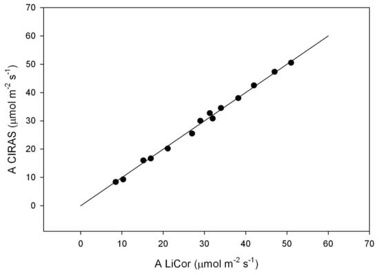 CO2 assimilation rates (A) of sunflower (Helianthus annuus) leaves at 2% O2 in N2 measured with a LiCor 6400 portable photosynthesis system, using the system corrections for O2 concentration, and measured with a CIRAS-3 portable photosynthesis system at the same sub-stomatal CO2 concentrations, without correction for O2 concentration. The line is the 1:1 line.