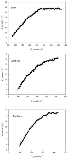 CO2 assimilation rate (A) over a range of sub-stomatal CO2 concentrations (Ci) in single bean (Phaseolus vulgaris), soybean (Glycine max), and sunflower (Helianthus annuus) leaves. Open symbols: steady-state data points. Closed symbols: data points obtained from ramped CO2 on the same leaves. See text for details of methods.