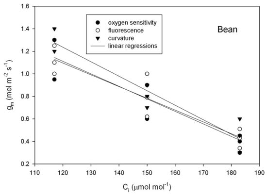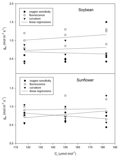 All three methods of estimating gm used here involve measurements of gas exchange at 21% O2, hence are potentially affected by photorespiration and CO2 transfer among cellular compartments, and are therefore potentially subject to the errors described by Tholen et al. []. The constant gm reported here for soybean and sunflower indicate that those potential errors in gm do not always occur even at low measurements Ci, while previous measurements of gm at low O2 indicate that photorespiration is not necessary to observe decreases in gm with increasing Ci [,]. Thus, it remains unclear how important the potential artefactual decreases in gm with increasing Ci identified by Tholen et al. [] may be in general, although they did affect the estimates of gm in soybean and sunflower in this experiment.