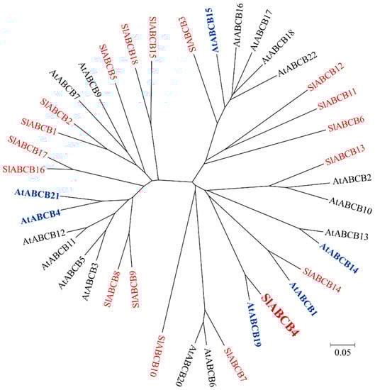 In the tomato genome, the ABCB subfamily is the second largest subfamily in the ABC transporter family, which is made up of 29 members, including 18 full-size, 8 half-size and 3 quarter-size ABCBs []. At least six full-size ABCBs, belonging to the Arabidopsis ABCB subfamily, were characterized as auxin transporters [] (Figure 1). These Arabidopsis ABCB auxin transporters share an evolutionary relationship with some full-size tomato ABCBs (Figure 1). For instance, tomato SlABCB4 and SlABCB14 are very similar to Arabidopsis AtABCB19 and AtABCB1, respectively. This suggests that SlABCB4 and SlABCB14 transport auxin in tomato.