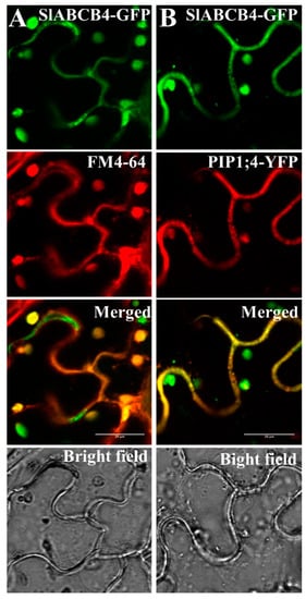 The subcellular localization of SlABCB4 was determined by the transient expression of the SlABCB4-GFP fusion protein in the epidermal cells of N. benthamiana leaves. In the epidermal cells, SlABCB4-GFP fusion proteins showed co-localization with the staining of plasma membrane by FM4-64 dye (Figure 2A). In addition, SlABCB4-GFP fusion proteins were co-localized with PIP1;4-mCherry fusion proteins (Figure 2B), which is a marker for plasma membranes [].