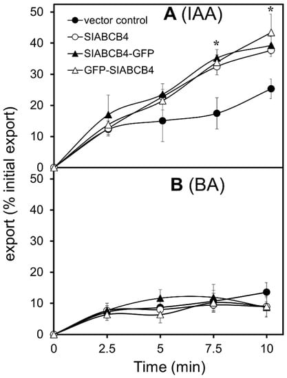Next, we performed a transport assay in the N. benthamiana protoplast expressing SlABCB4. Simultaneous IAA and BA transport assays revealed IAA export activity, but not BA export activity (Figure 3B). These results suggest a role of SlABCB4 in auxin export from cytosol to apoplast [], as previously reported for AtABCB1, AtABCB4 and AtABCB19 [].