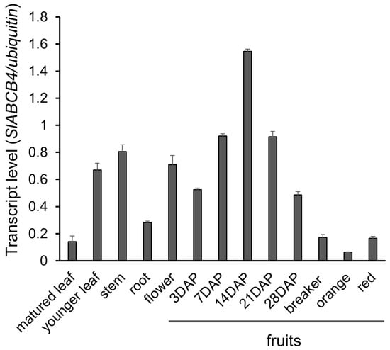 To understand the physiological roles of SlABCB4 in tomato, gene expressions of SlABCB4 in various organs and tissues (i.e., leaf, root, flower and developing fruits) were determined by RT-qPCR. Moderate SlABCB4 expressions were detected in the flower, young leaf and stem (Figure 4). In the root and mature leaf, low gene expressions of SIABCB4 were detected. The SlABCB4 expressions were higher at early stages of fruit development, with the highest at 14 DAP (Figure 4). The gene expression level declined after 21 DAP and continued to decline at fruit maturation and ripening. These results suggest that SlABCB4 plays a more important role in the early stages of tomato fruit development than at other stages. It is proposed that the distribution of auxin at the early stage of fruit development is important for regulating cell division and expansion []. In tomato, cell division occurs between 7–14 DAP, followed by cell expansion, which may occur between 10–45 DAP [,]. Therefore, the highest expression of SlABCB4 in 14 DAP may show an important role of SlABCB4 in auxin distribution for cell division and expansion of tomato fruit [].