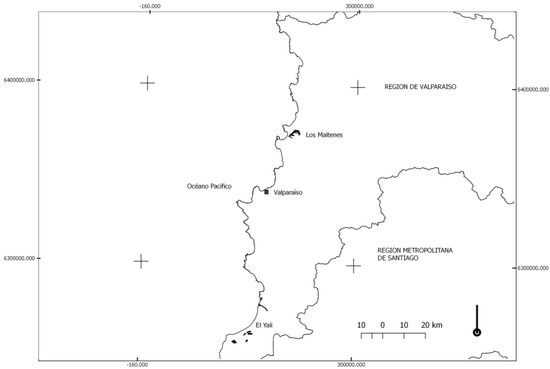 Los Maitenes coastal wetland is located at latitude 320°45′S and longitude 710°28′W, close to a rural location with fewer than 200 habitants. It is less than 4 km away from a strategic industrial area and seaport composed of foundries and companies that generate energy from natural gas and coal. Moreover, Los Maitenes belongs to the wetland systems in south-central Chile, formed by the coastal plain catchment. Matanzas lagoon is located at latitude 330°49′S 330°43′S and longitude 710°46′W 710°22′W. Figure 1 shows the location and distance between the coastal wetlands.