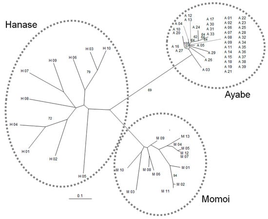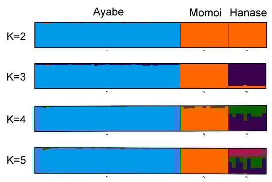 The genetic structure of these populations was examined by STRUCTURE analysis. The maximum delta K value was observed at K = 2 (Table 3), suggesting that their ancestral population was derived from two populations, and that the ancestors of Ayabe and those of Momoi and Hanase were derived from different populations (Figure 3 and Table 3).