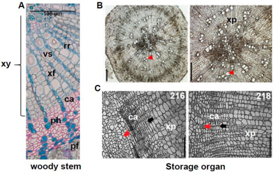 Cross-sections of birch (Betula pendula) stem (A) and storage organs of radish (Raphanus sativus) (B,C). Angiosperm wood is composed of xylem fibres and vessels to a large extent (A), while there is a substantial number of xylem parenchyma cells in the radish of three-week-old line 216 (B). The red arrow head indicates one of the xylem vessel cells. The size bar is 200 µm (B). The line 216 (left), which generates the larger storage organ, harbours a wider cambial zone when compared with the line 218 (right). Cambium zones are marked by red and black arrows with the red arrows on the side of the cortex region. The size bar is 100 µm (C). Abbreviations: xy—xylem; vs—vessel; xf—xylem fibre; rr—radial ray; ca—cambium; ph—phloem; pf—phloem fibre; xp—xylem parenchyma. (A) By courtesy of Chang Su, University of Helsinki; (B) and (C) adapted with permission from Jang et al. (2015) [106] and http://www.biologists.com/journal-of-experimental-biology/ doi:10.1093/jxb/erv220.
