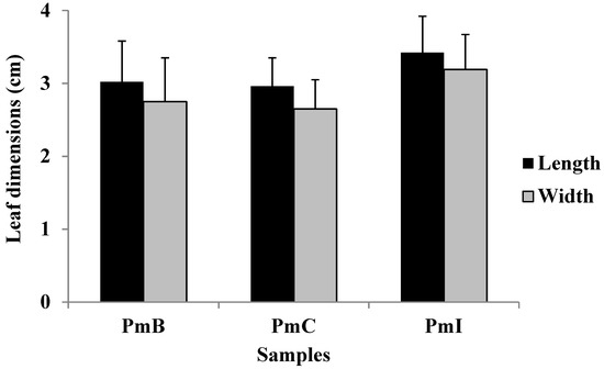 Leaf dimensions of Phania matricarioides collected from different geographical localities in Cuba. PmB: collected in Bauta, Artemisa Province, Cuba; PmC: collected in Cangrejeras, Artemisa Province, Cuba; PmI: collected in gardens of the Faculty of Pharmacy and Foods, La Lisa, Havana Province, Cuba. Results are the means with standard deviations of 100 leaves obtained from 20 plant samples from each area.