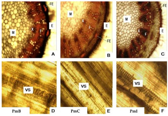 Microscopic analysis of the stems (Figure 4A–C) allowed the visualization of the E with a layer of cells in the PmI samples, whereas in the PmB and PmC samples it has several layers of cells. Sclerenchyma fibers are present which are more compact in PmI sections. It was possible to observe xylem (X) and phloem (F) formed by well-defined cells, with a similar appearance in PmB and PmC. The pith (M) formed by spherical cells of variable size was observed in the center, but they were larger in the samples of PmB. The longitudinal sections of the stems (Figure 4D–F) showed a helical VS, which was larger in the longitudinal sections of PmB.